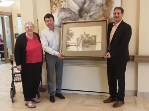 Today, Evangeline MacGillivary, a resident who moved in not long after we opened, approached the owners Tom Gallivan  and Al Clausi with a very generous gift.  Evangeline told them the story of how she came to own an original Vyfvinkel.  When she and her husband sold their home, they accepted this fine work of art, entitled “Boldt Castle Powerhouse” as the down payment from the artist himself.