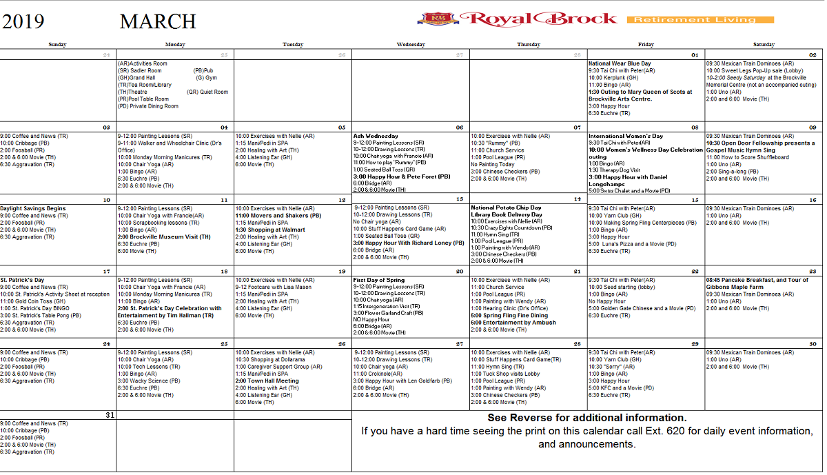 View the calendar to find out what the residents of Royal Brock are doing to keep busy in March. Find outings, events, entertainment, and more.