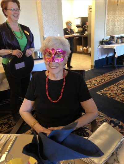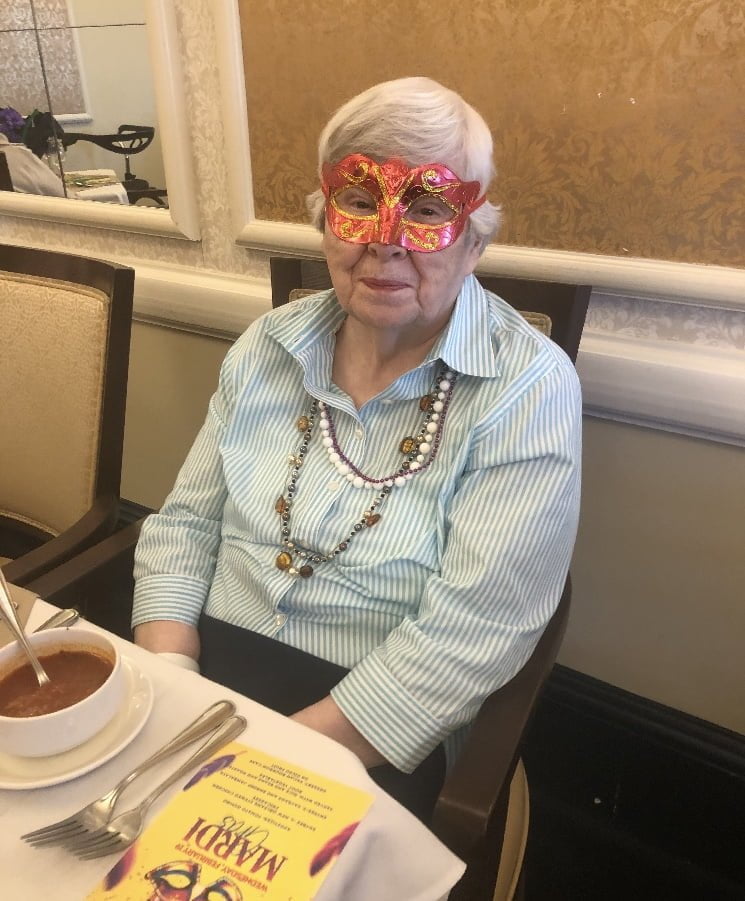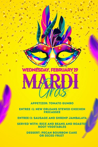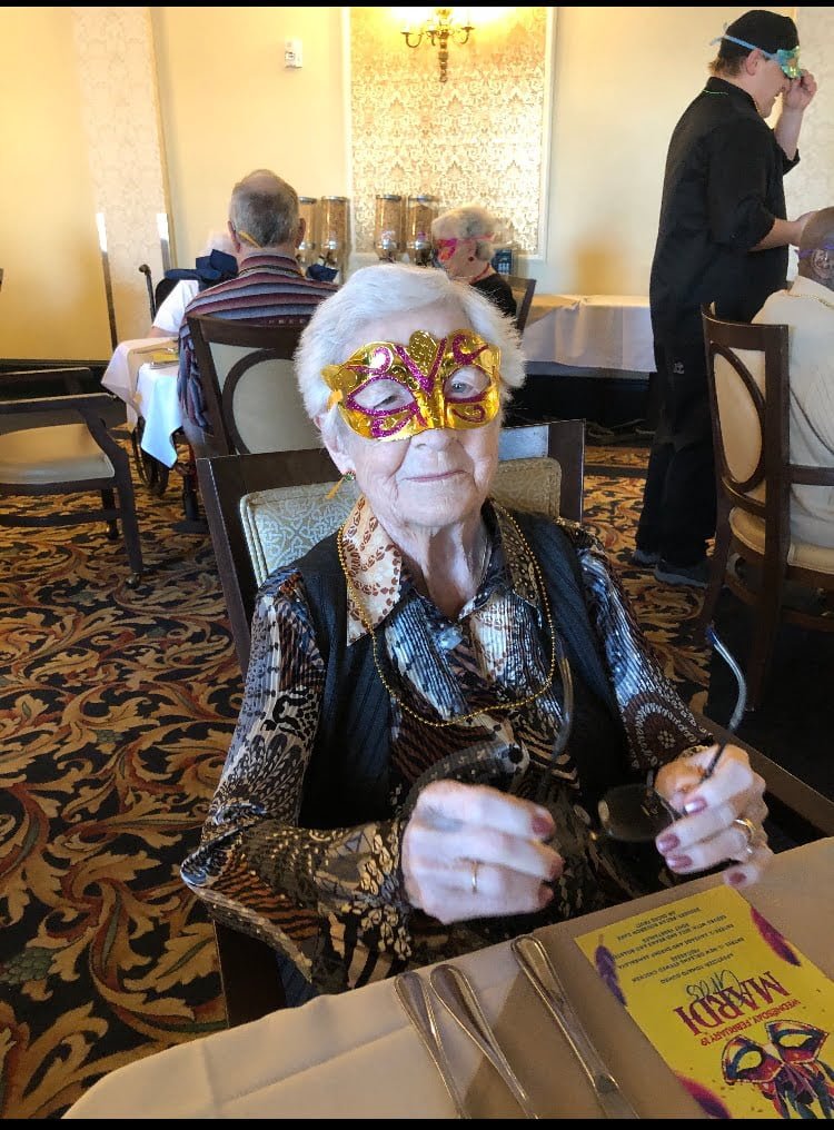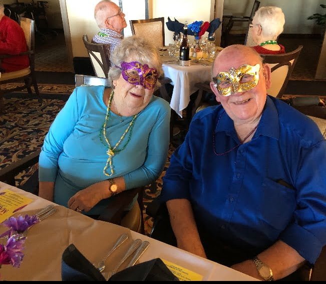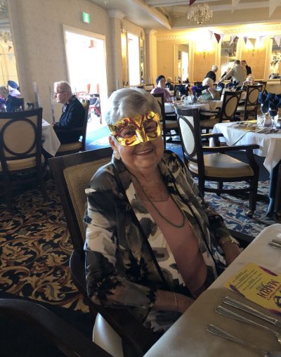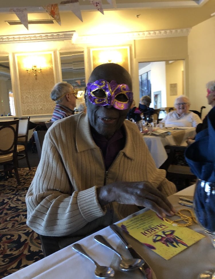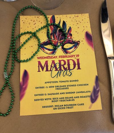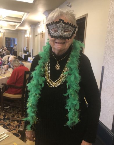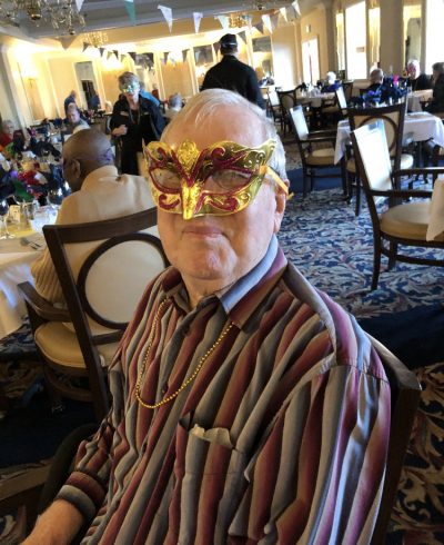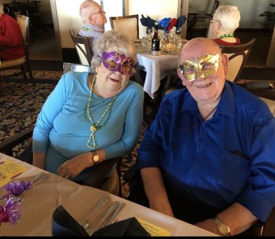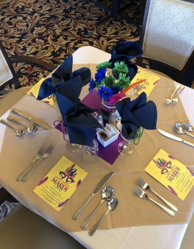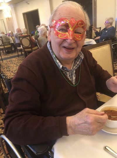 This month we did Fine Dining with a twist! We celebrated Mardi Gras. The flags that were hung, were created by using the residents very own artwork. Everyone dressed up and got into the celebration! The food was incredible! Tomato Gumbo, New Orleans Stewed Chicken Fricasee, Sausage & Shirmp Jambalaya served with rice and beans and roasted root vegetables. Desert was a delectable Pacan Bourbon Cake. Entertainment was provided by Jumpin’ Jimmy Leroux. The staff and residents always have so much fun here at Royal Brock Retirement Living!