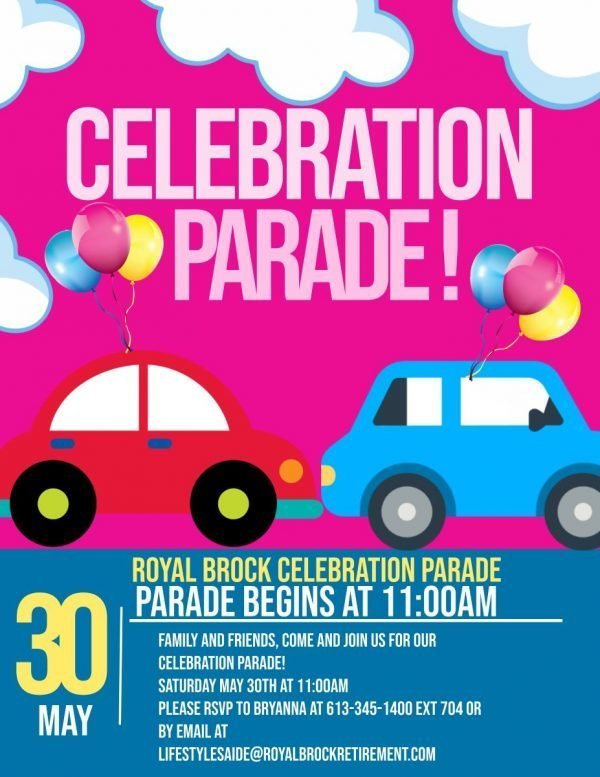 With our Covid-19 Outbreak being declared over we have decided to reschedule our parade! This is a celebration! Please join us on Saturday May 30, 2020 at 11:00. We ask that all participants remain inside their vehicles at all times. Social distancing is still in place. Please contact Bryanna at lifestylesaide@royalbrockretirement.com to volunteer.