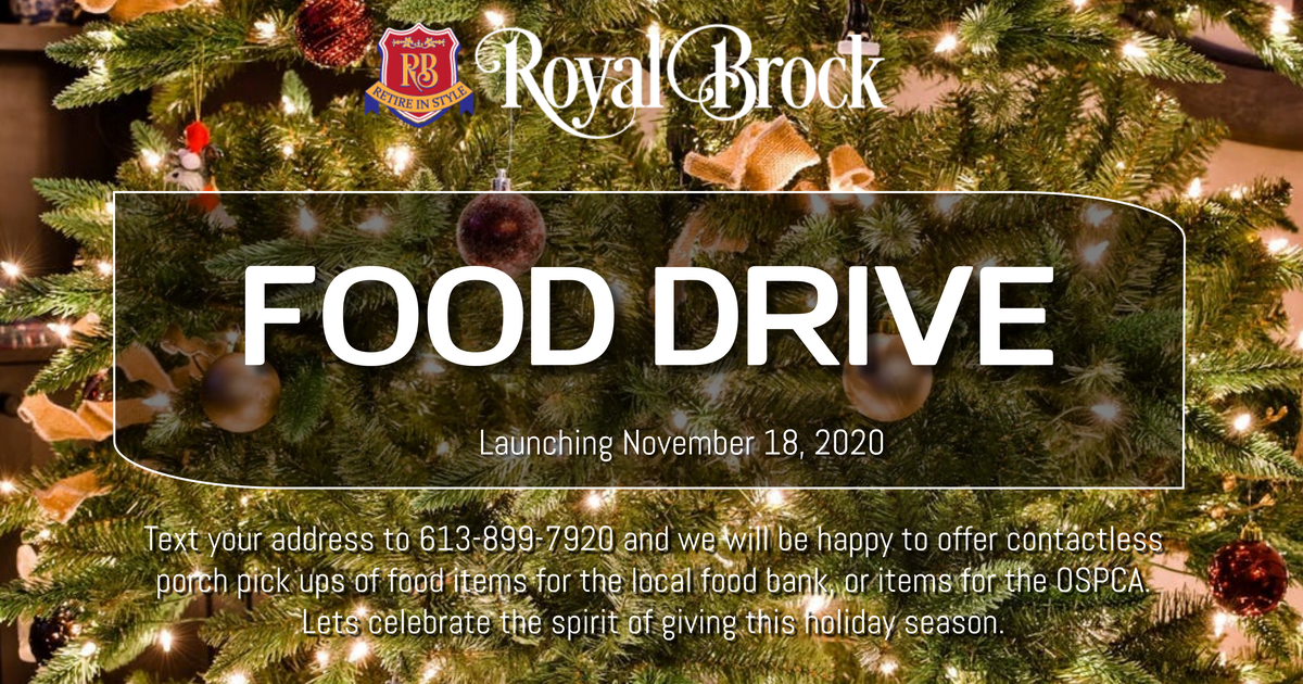 Join us for our holiday food drive! Everyone who donates will be entered into a draw to win a beautiful holiday basket valued at $150.00! All you have to do is text me your address and I will arrange for a time to do a contactless porch pick up. We will accept donations to both the local food bank, as well as the OSPCA. 613-899-7929. You can also email me at stacey@royalbrockretirement.com