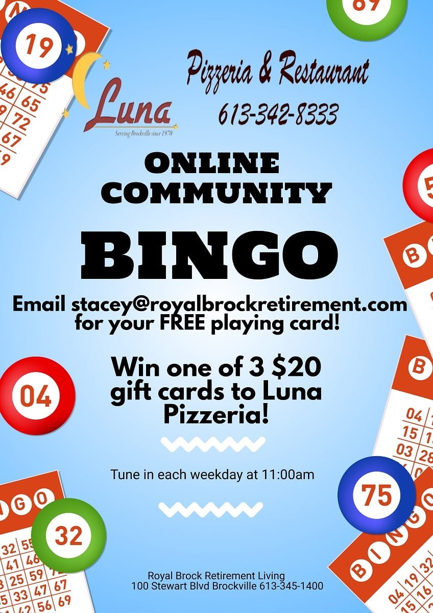 Hi Everyone! Welcome back to our Online Community Bingo! It fun, free and easy to play! Just “like” our facebook page Royal Brock Retirement. email stacey@royalbrockretirement.com to receive your FREE Bingo card! tune in each day to get 5 new numbers. Numbers are posted Monday through Friday at 11:00 am. Good Luck!!! #supportlocalbusiness