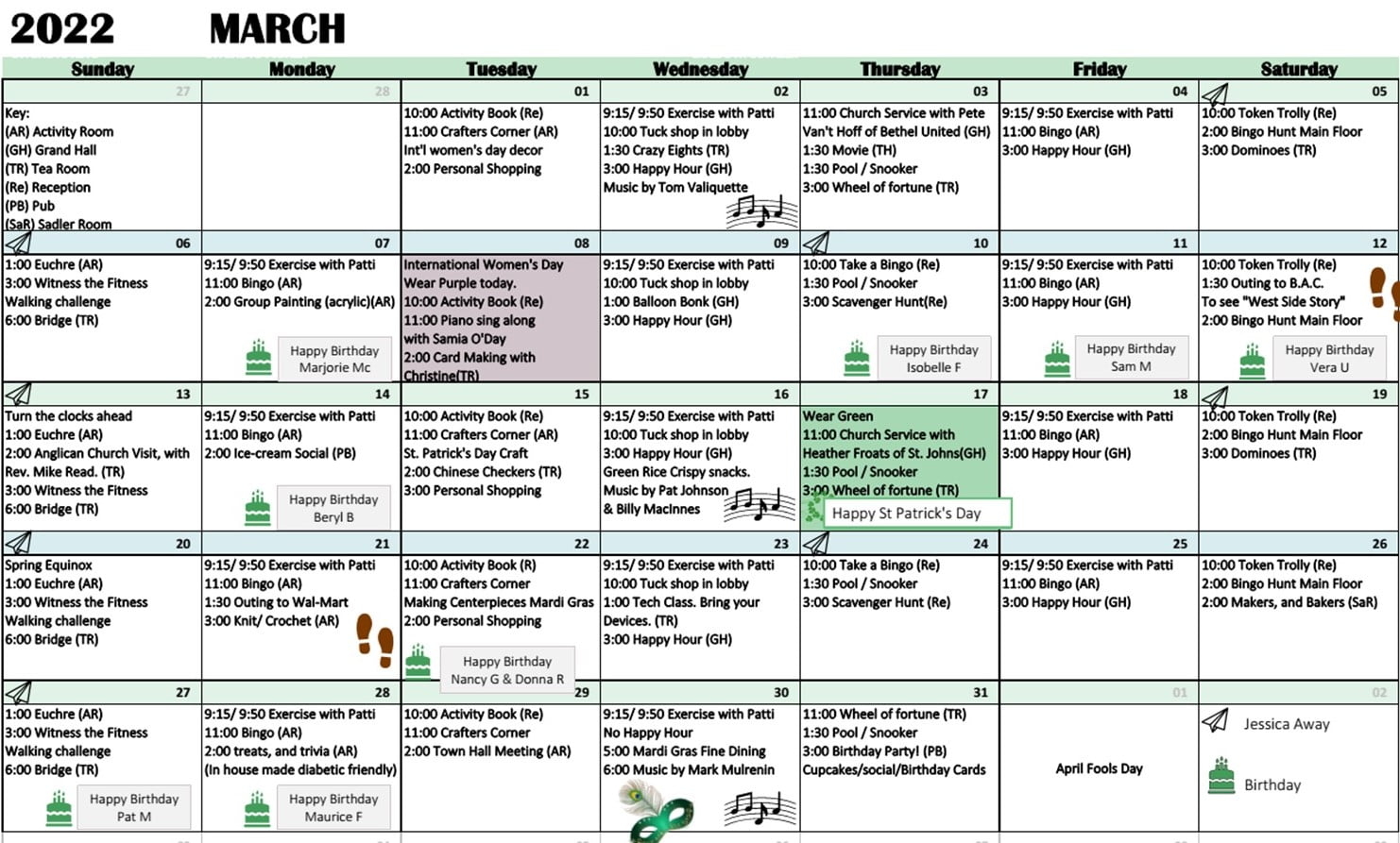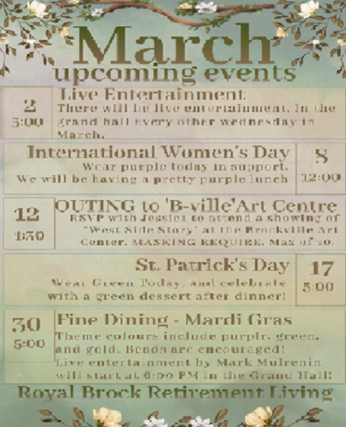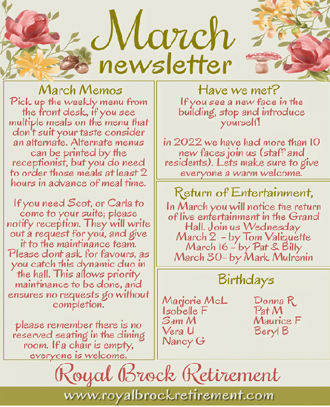 Royal Brock Retirement Living is an active and vibrant community in Brockville. We are proud of our activities, our commitment to senior living wellness initiatives, and our wonderful staff. Retirement residence living is engaging and fun. Scroll down for your monthly activity sheet, staff bios and other news we just have to share.