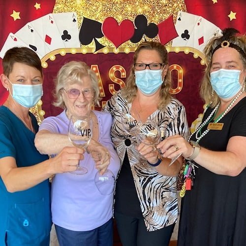 Viva Brockvegas! Royal Brock residents were All In at this month’s Casino fine dining event. Afternoon fun and games ushered the High Rolls into dining and dancing to the live music of Jimmy Leroux. The Culinary team served up a VIP feast beginning with a crisp arugula salad, granny smith apples, toasted walnuts and feta cheese with a lemon vinaigrette. Slow roasted prime rib topped with demi glace served with garlic shrimp Upped the Ante before they Sweetened the Pot with a delicious Chocolate swirl cheesecake. There is no doubt that this months fine dining event Hit the Jackpot!