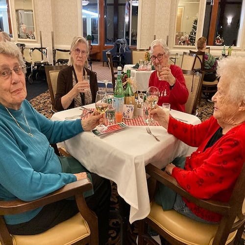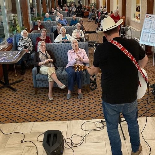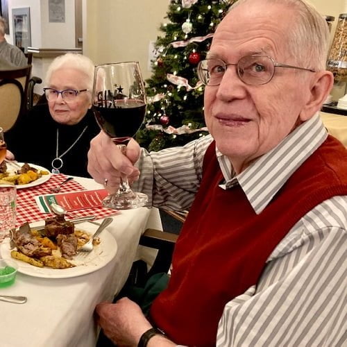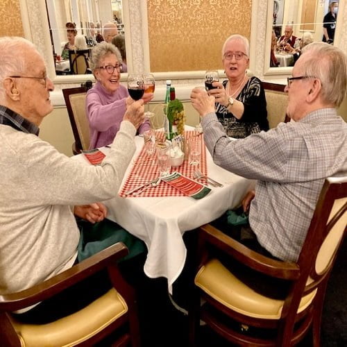 It was an evening in little Italy for our Royal Brock Retirement Living famiglia at this months fine dining event. Benvenuti a tuttito to a country where a simple ciao and an appreciation of La Dolce far Niente, the “sweetness of doing nothing” can go a long way with the friends at your dinner table. Italians focus on good and simple: family and friends, good food and drink, and hearty conversation. Andiamo a cena? Salute! to a nice bicchiere di vino, some sparkling Sanpellegrino and trio tomato Bruschetta with fresh bread. Buon Appetito! Chicken parmesan in marinara sauce and provolone cheese, herb Tuscan lamb chops with a balsamic garnish, Italian seasoned fingerling potatoes and roasted butternut squash with sage and red onion. Before we could say Basta! Basta! Amaretto Tiramisu. Bravo! to our talented Culinary team and Dietary staff, fate bene. Andiamo! Lets go sing and dance to intrattenitore musicale Cowboy Mark McDonell until we had to say buona serata. Ciao!