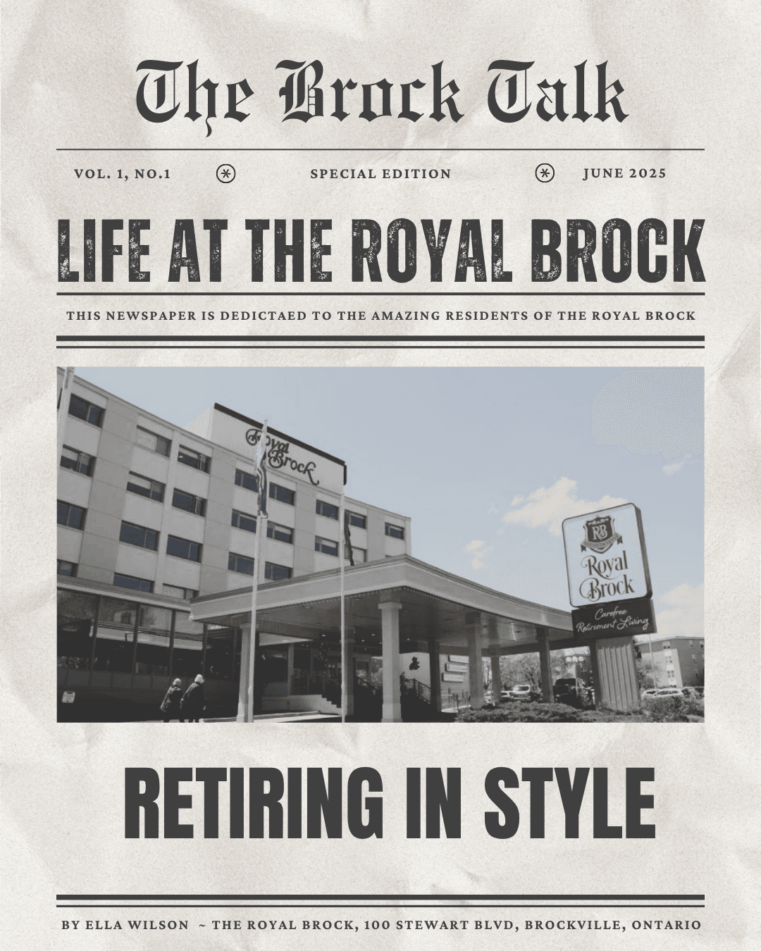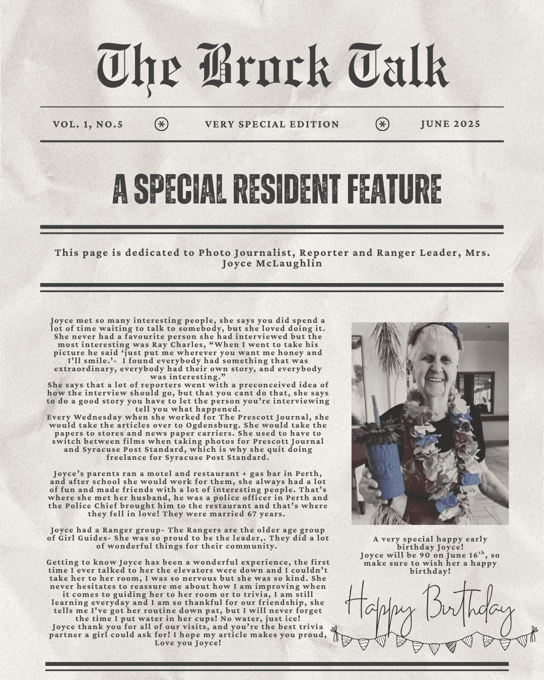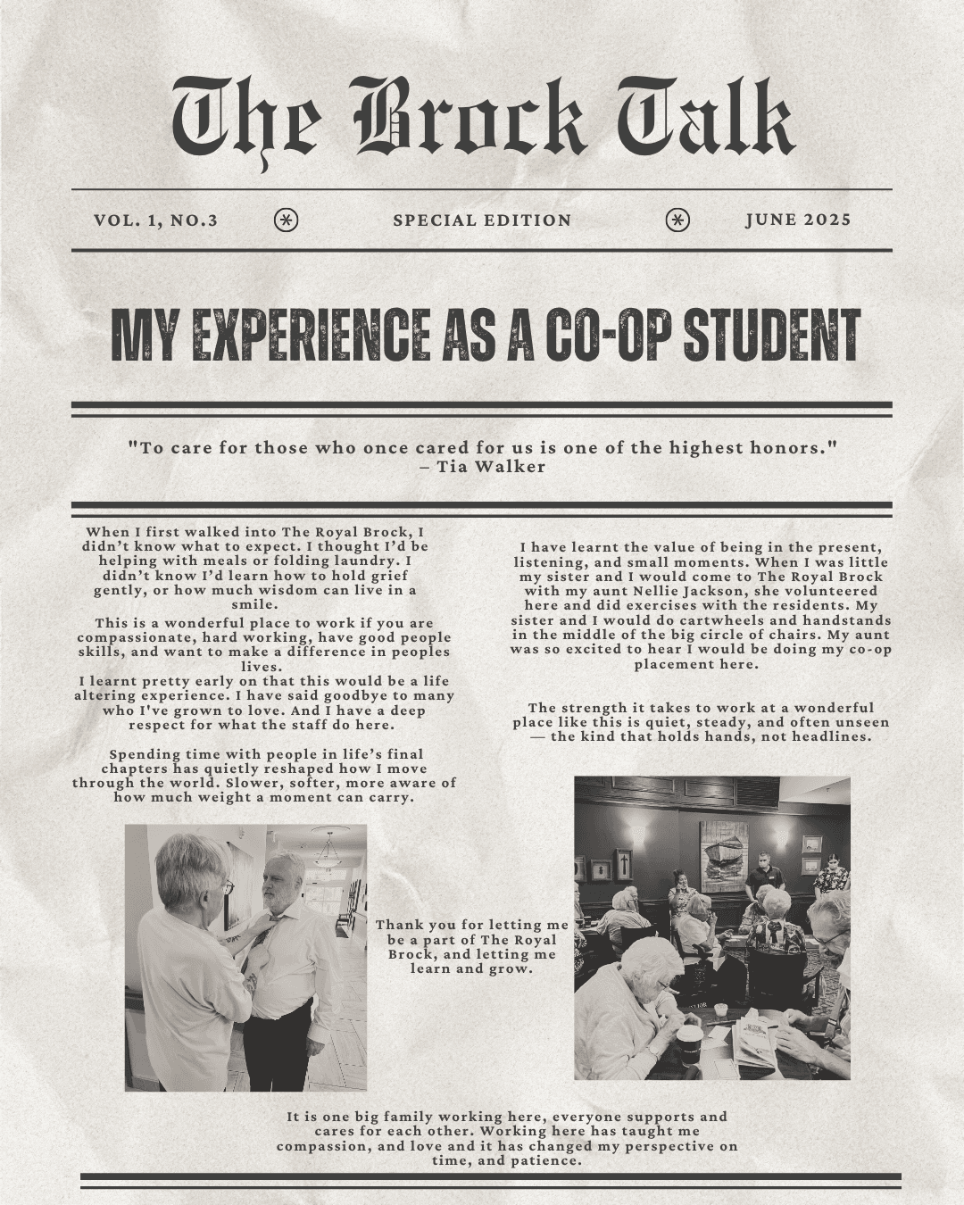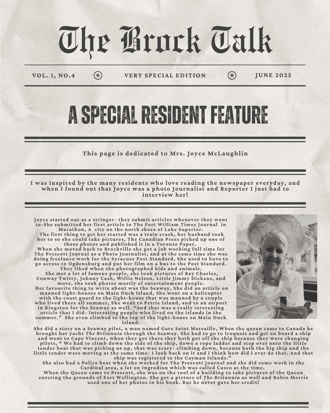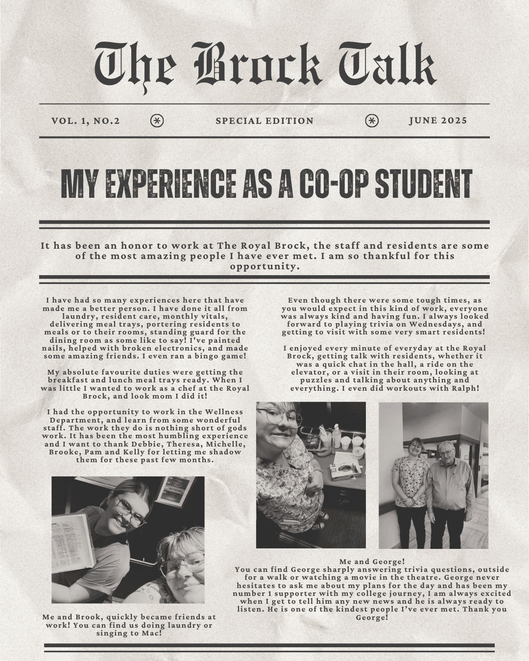 Most recently, we had the joy of working with Ella, a bright and compassionate co-op student who has been with us for the past several months. As part of her class project, Ella created a beautiful newspaper that captures her time at Royal Brock. She thoughtfully included stories and reflections, most notably her heartfelt friendship with one of our cherished residents, Joyce—a former photojournalist.