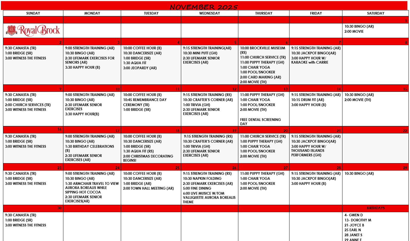Royal Brock Retirement Living is an active and vibrant community in Brockville. We are proud of our activities, our commitment to senior living wellness initiatives, and our wonderful staff. Retirement residence living is engaging and fun. Scroll down for your monthly activity sheet, staff bios and other news we just have to share.