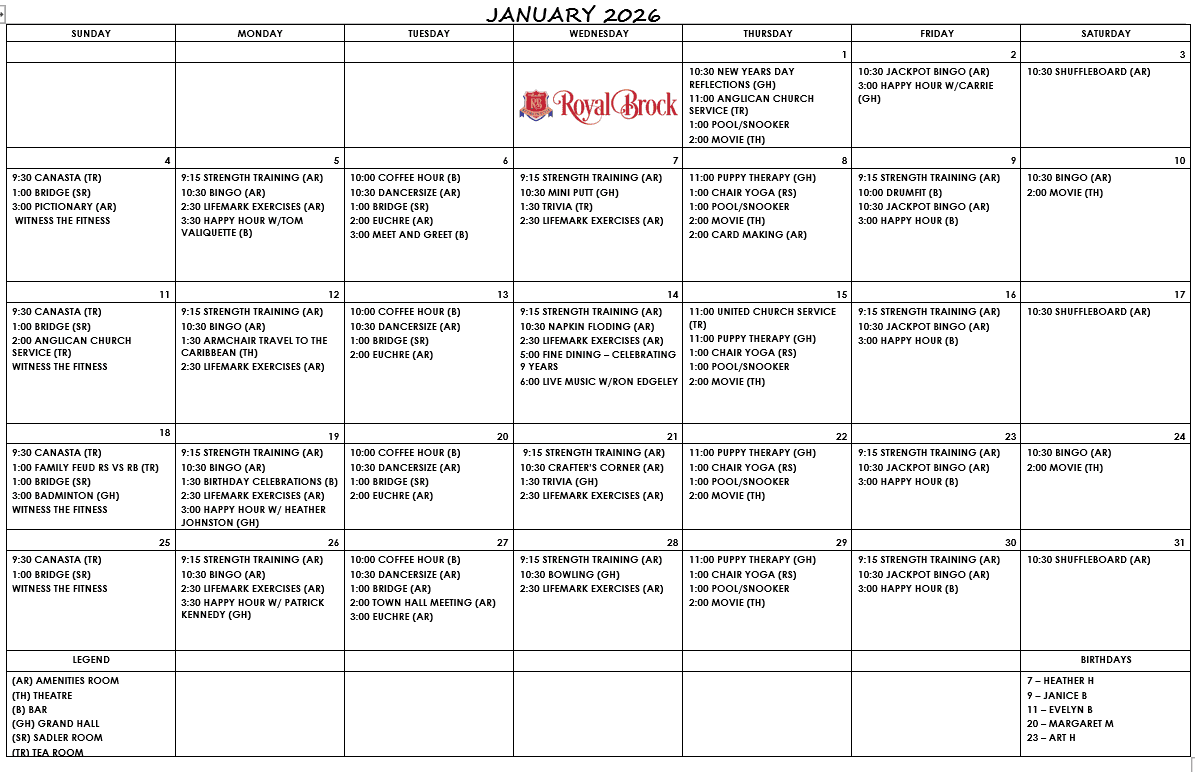 Royal Brock Retirement Living is an active and vibrant community in Brockville. We are proud of our activities, our commitment to senior living wellness initiatives, and our wonderful staff. Retirement residence living is engaging and fun. Scroll down for your monthly activity sheet, staff bios and other news we just have to share.