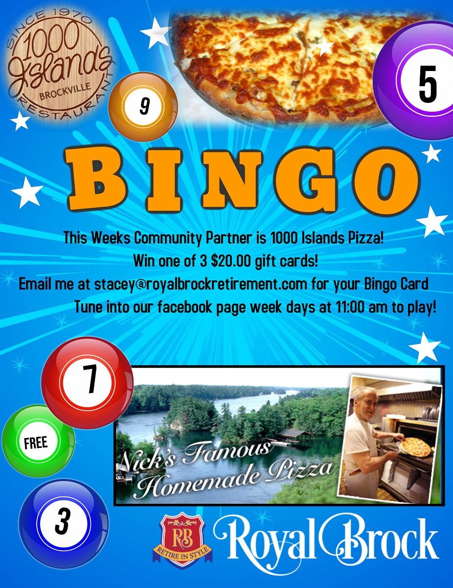 This weeks community partner is 1000 Islands Pizza! Email me at stacey@royalbrockretirement.com to receive your FREE Bingo card. Each week day at 11:00am, we will…